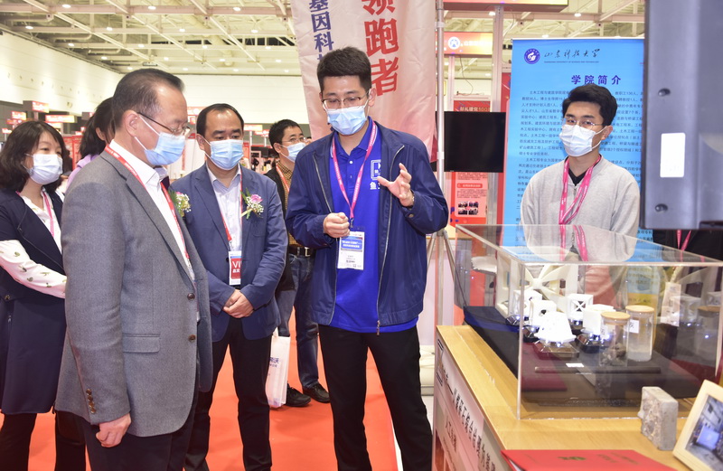 本届“高博会”期间,首届高等学校科技创新大会同期举办。“献礼建党100周年”高校科技创新成果展是创新大会的重要板块,筛选了来自全国61所高校的336个科技创新成果进行展出,beat365官方网站科技处精心组织学校相关成果参会,筛选了井巷喷浆粉尘污染防治关键技术及装备、铝离子电池等12项科技成果参展,基本涵盖了所有八大展区,通过设备实物展台展出,多媒体设备播放、展板展示等多样化的展示形式参展,生动直观地将学校科技成果进行呈现,吸引了众多观众关注。