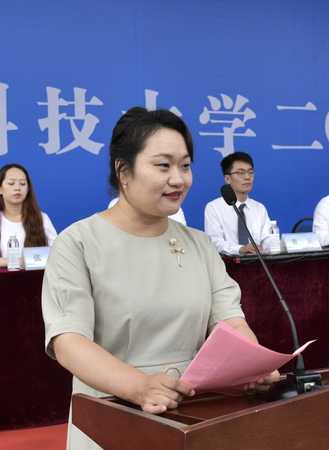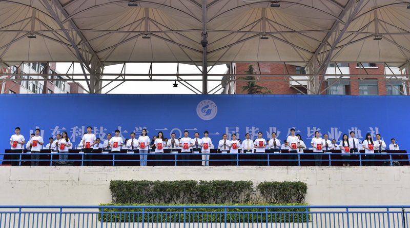 毕业典礼上,全体毕业生面对鲜红的国旗,庄严宣誓,表达了“爱党爱国,牢记使命;爱校荣校,勤学笃行;爱岗奉献,敬业实干;惟真求新,敢于担当;坚韧不拔,发奋图强;不忘初心,勇做新时代追梦人”的人生誓言,用掷地有声的誓言为自己的大学生涯画上了圆满句号。