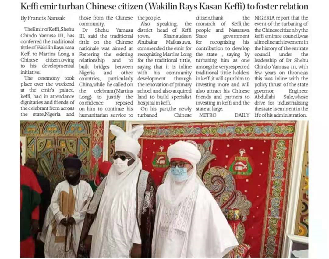 据悉,为尼日利亚当地经济或社会发展、民众生活改善等做出突出贡献者可被授予酋长头衔。(通讯员:于鹏伟 毕桂涛 责编:徐展)