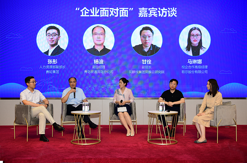 企业HR面对面访谈环节,来自联通、凤麟核、赛轮、歌尔四家企业的资深招聘负责人结合自身经历,分享了自己的留青就业故事,为现场同学提出了职业规划和就业选择建议。