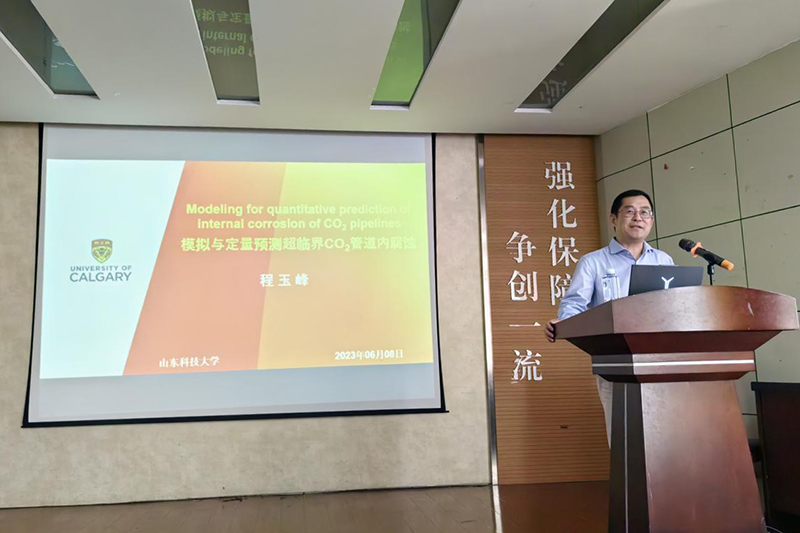 会见结束后,程玉峰院士受邀作了题为“模拟与定量预测超临界CO2管道腐蚀”的学术报告,从超临界CO2管道腐蚀工程历程、研究进展、关键科学问题、技术难点与面临的挑战等方面对超临界CO2管道研究与应用进行了精辟而全面的分析与阐述,并与参加报告会的师生进行了互动,回答了大家关心的问题。(通讯员:崔蓝月 摄影/责编:信永华)