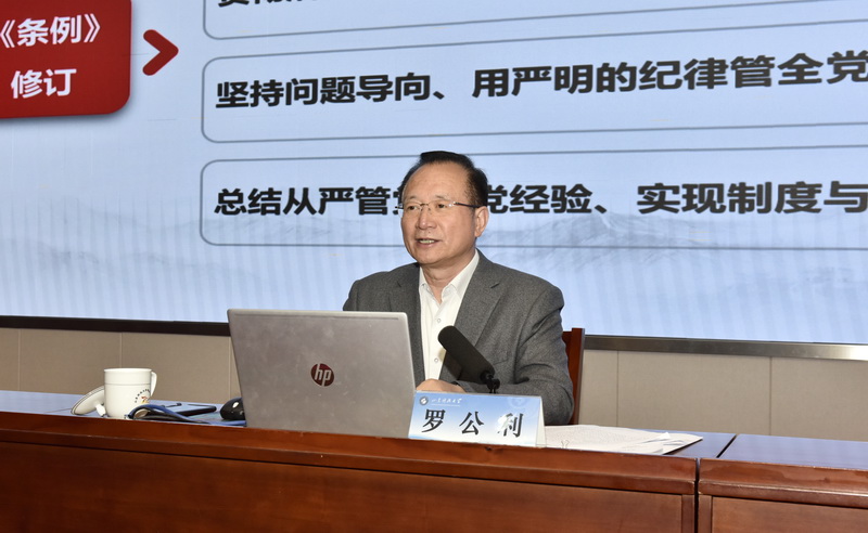 罗公利以“深入开展党纪学习教育 为学校高质量发展提供坚强政治保障”为主题作辅导报告。报告紧扣习近平总书记关于党的纪律建设的重要论述,深刻阐述了《条例》修订的背景、过程及重大意义、精髓要义,逐条讲解了《条例》修订的主要内容,并紧密联系具体案例进行剖析,引导党员干部准确全面把握《条例》的主旨要义、丰富内涵和实践要求。