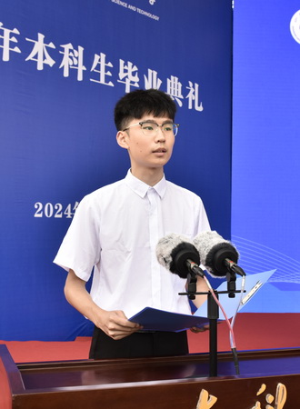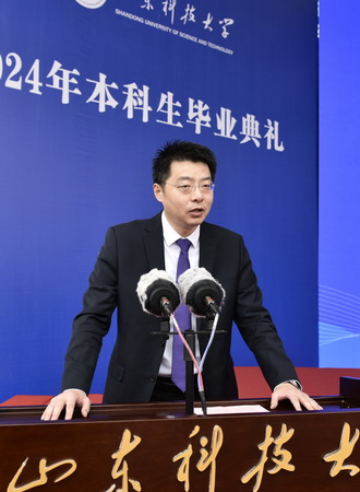 曾庆田代表学校向圆满完成学业的2024届全体本科毕业生表示热烈的祝贺和深情的祝福,向为此付出辛劳的老师、家长致以崇高的敬意和衷心的感谢。他深情回顾了同学们从入山科到驻山科再到出山科、念山科的成长历程,分享了优秀毕业生不平凡的青春追梦故事,他表示,四年的求学时光记载了同学们朝气蓬勃的青春风采,也承载了大家绚丽多彩的青春梦想,学校见证了同学们从青涩懵懂到坚定自信,看到了大家在青春赛道上奋力奔跑的模样,这些经历都将成为同学们人生路上宝贵的积淀。同学们即将重新起航,踏上新征程,希望同学们不负青春、不懈努力,在实践中淬炼,在拼搏中磨砺,努力成为“行稳致远”的奋进者、开拓者、奉献者。