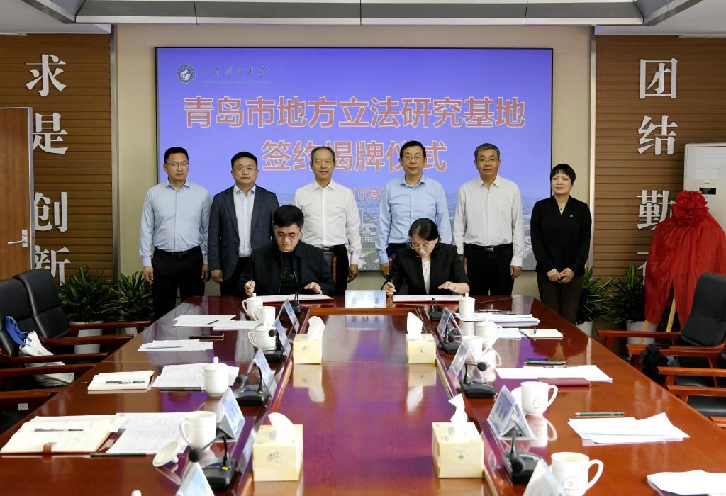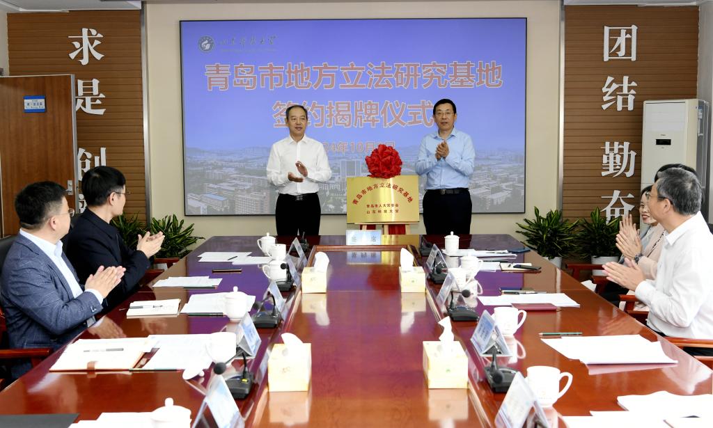揭牌仪式上,双方签订了合作建立“青岛市地方立法研究基地”框架协议,刘明永与陈金国共同为基地揭牌。签约揭牌仪式由青岛市人大常委会法制工作委员会主任张桂芹主持。