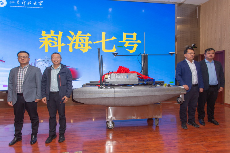 出征仪式上,翱飞(无锡)科技有限公司、北京星天科技有限公司、北京海卓同创科技有限公司向学校捐赠科考设备。与会领导共同为新一代极地无人船“嵙海7号”揭幕。现场还播放了极地无人船研制纪实视频,带领大家回顾了“嵙海”系列历代极地无人船的研发过程,介绍了新一代智能无人船的自主研制和试验情况。