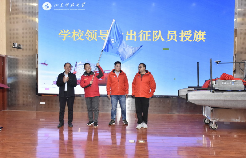 校长曾庆田出席仪式,并为科考队员、青年教师魏峥嵘、乜云利、刘小栋授旗。他在讲话中向参加此次极地无人船研制及试验的极地探测技术与装备团队师生表示祝贺,并指出,2024年是中国极地考察40周年,也是学校师生进入国家海洋“战队”的第三次南极科考,代表着我校服务国家海洋强国建设又迈出了坚实一步。希望极地勘测技术与装备团队聚焦科技攻坚方向和重点领域,主动对接国家战略,以自身技术优势积极赋能国家极地、深海科学考察,在服务国家战略中推动学校高质量发展。