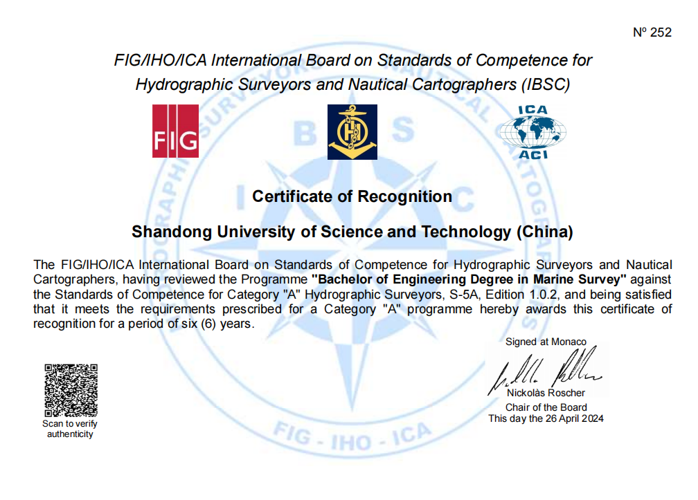 近日,由国际测量师联合会、国际海道测量组织和国际制图协会(FIG/IHO/ICA)联合组成的国际海道测量师和海图制图师能力标准委员会(IBSC)发来函告:beat365官方网站测绘与空间信息学院“海洋测绘工程工学本科专业教学计划”获得国际A级认证。beat365官方网站成为国内非军方高校唯一获得该资质的单位。