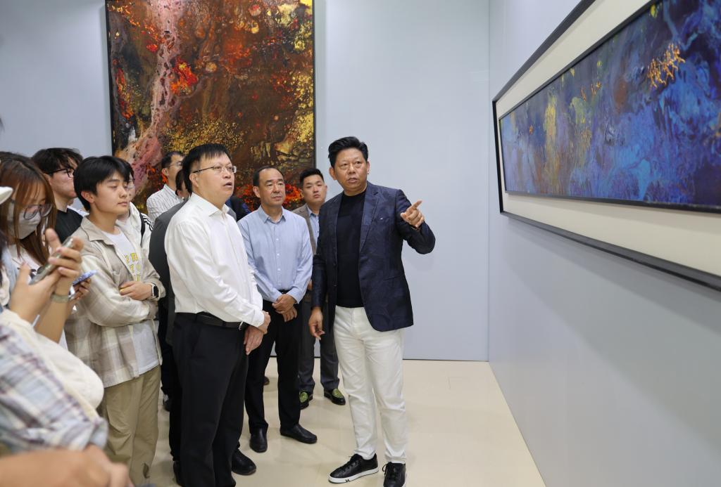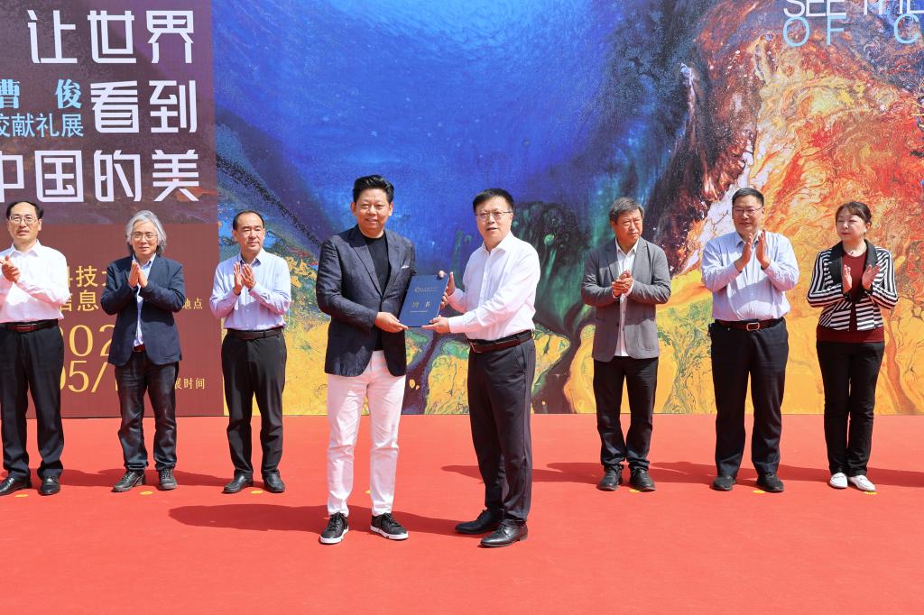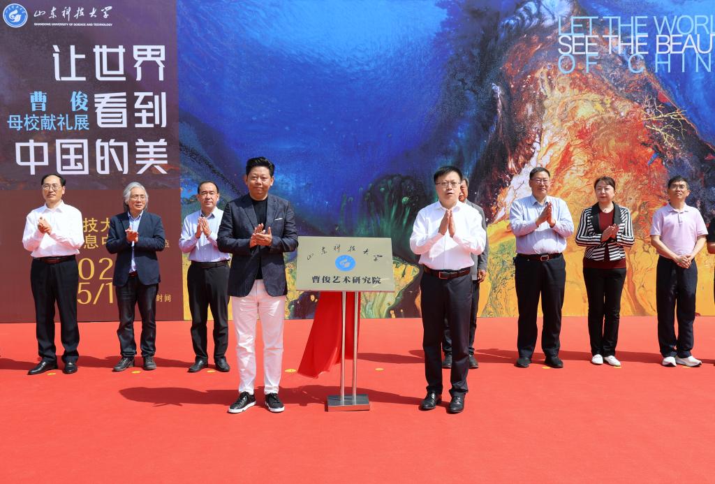 水鸟从容地在山水间飞过,科大师生熟悉的泰山仿佛直接被搬到展厅;静谧又热烈的蓝色、写意又生动的泼墨,带有强烈视觉冲击的色彩扑面而来,一眼让人踏入广袤的宇宙景观中……5月19日,“让世界看到中国的美”曹俊母校献礼展在beat365官方网站图书馆开幕,我校采矿工程1985级校友、国际艺术家曹俊回访母校,带着他的部分精品力作举办展览。
