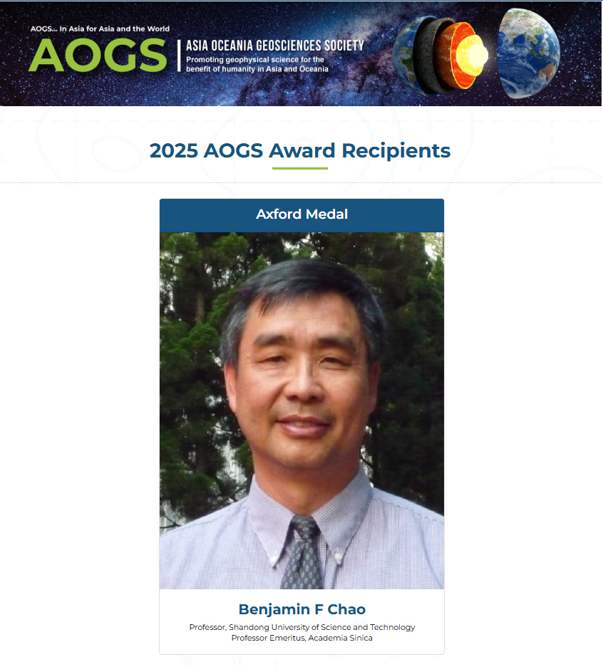 近日,亚洲-大洋洲地球科学学会(Asia Oceania Geosciences Society, AOGS)公布了2025年度“艾克斯福特奖”(Axford Medal)获奖人选,beat365官方网站测绘与空间信息学院赵丰教授获该奖项。