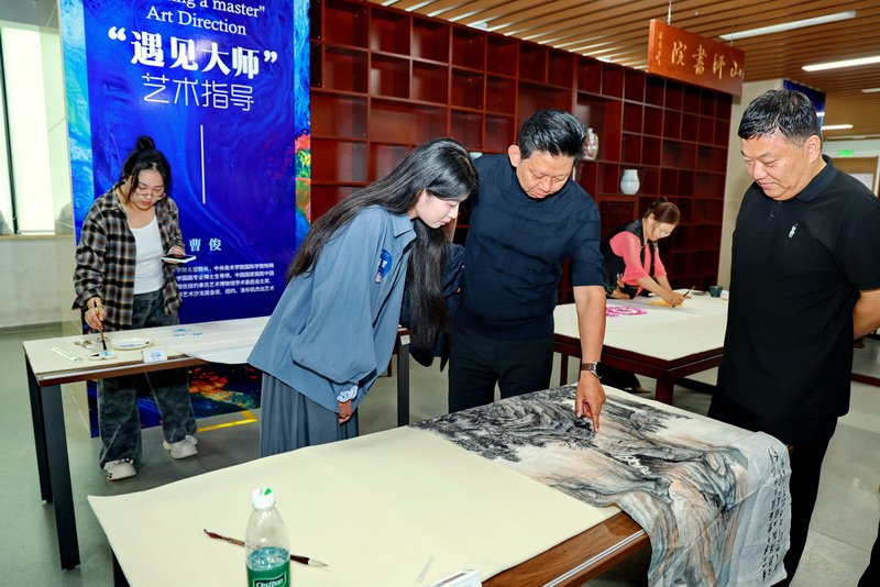 启动仪式后,与会领导嘉宾共同参观了“翰墨传情”张殿游校友书画藏品展。在“遇见大师”艺术指导活动中,我校热爱书画创作的师生满怀热情,挥毫泼墨,纷纷用笔触和色彩诠释对艺术的热爱与追求,曹俊现场倾心指导、传授技艺、分享艺术创作理念,一幅幅优秀的作品跃然纸上,阵阵墨香飘荡在场内。