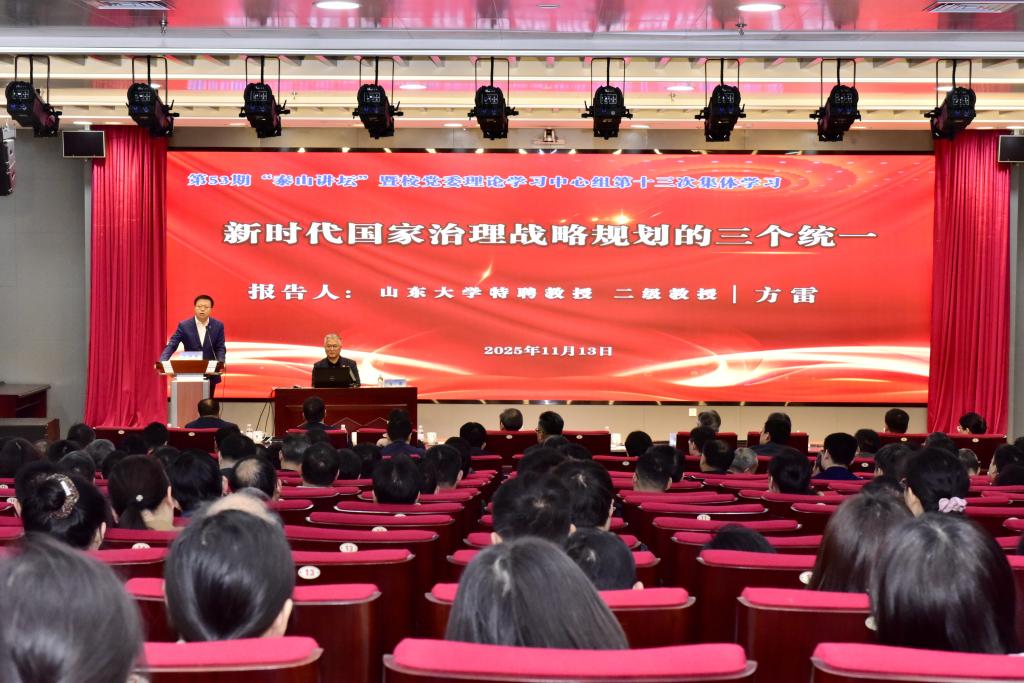 11月13日,beat365官方网站第53期“泰山讲坛”开讲,山东大学特聘教授、二级教授方雷应邀作题为《新时代国家治理战略规划的三个统一》的专题学术报告。校党委书记王君松主持报告会,校党委理论学习中心组成员和处级以上干部,机关科级干部、专职组织员、思政课教师、学生工作干部等千余人同赴一场“思想盛宴”。