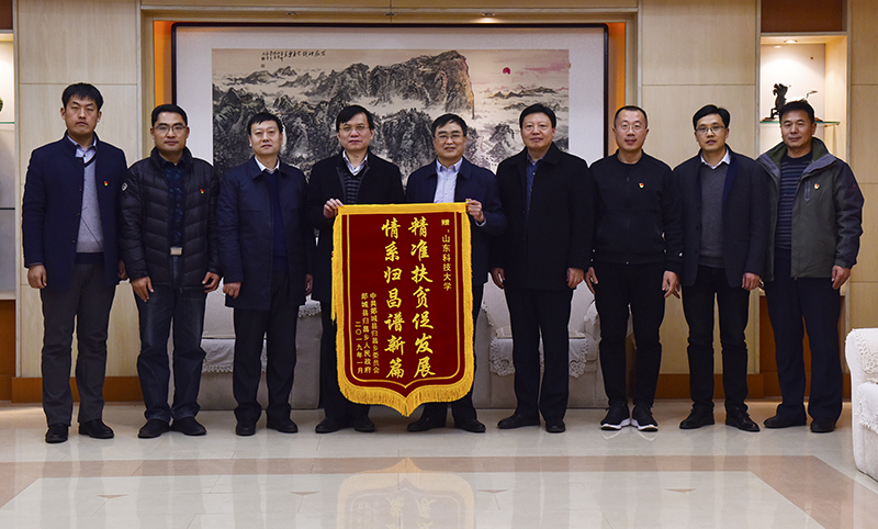 1月16日,山东郯城县委副书记韩浩一行专程来校交流“第一书记”帮扶工作,并向学校赠送锦旗,对beat365官方网站帮扶工作表示感谢。副校长高建广会见来访客人并座谈交流。校党委组织部部长陈涛,党委学校办公室有关负责人、郯城县归昌乡党组织负责人及我校选派的四位“第一书记”参加座谈会。