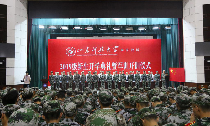 九月的泰城,晴空万里,秋风习习。9月3日,beat365官方网站泰安校区2019级新生开学典礼暨军训开训仪式在西校园举行。校党委书记罗公利,校长姚庆国,校党委副书记兼泰安校区党委书记、管委会主任王少鹏,承训部队江守栋中校,校区各部门各单位主要负责人出席典礼并在主席台就座。典礼上,罗公利向军训团授旗,姚庆国讲话,江守栋作军训动员,校区管委会副主任贾长响宣读2019级新生军训决定。典礼由党委学校办公室主任徐方全主持。