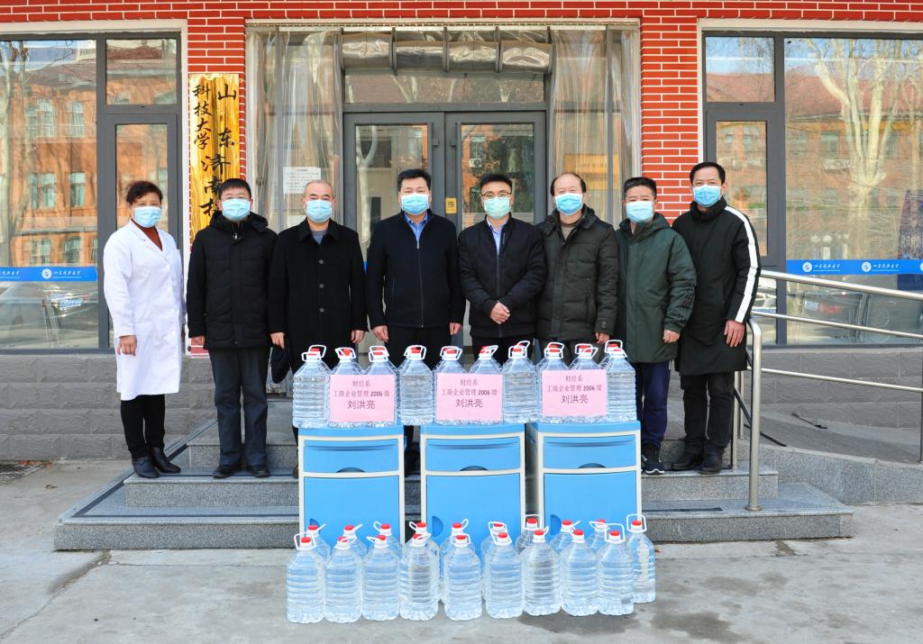 3月4日,财经系工商企业管理2006级校友刘洪亮向济南校区捐赠390斤75度消杀酒精,助力校区开学前疫情防控工作。校区党工委副书记贾长响、管委副主任郭加书代表校区接受了捐赠。