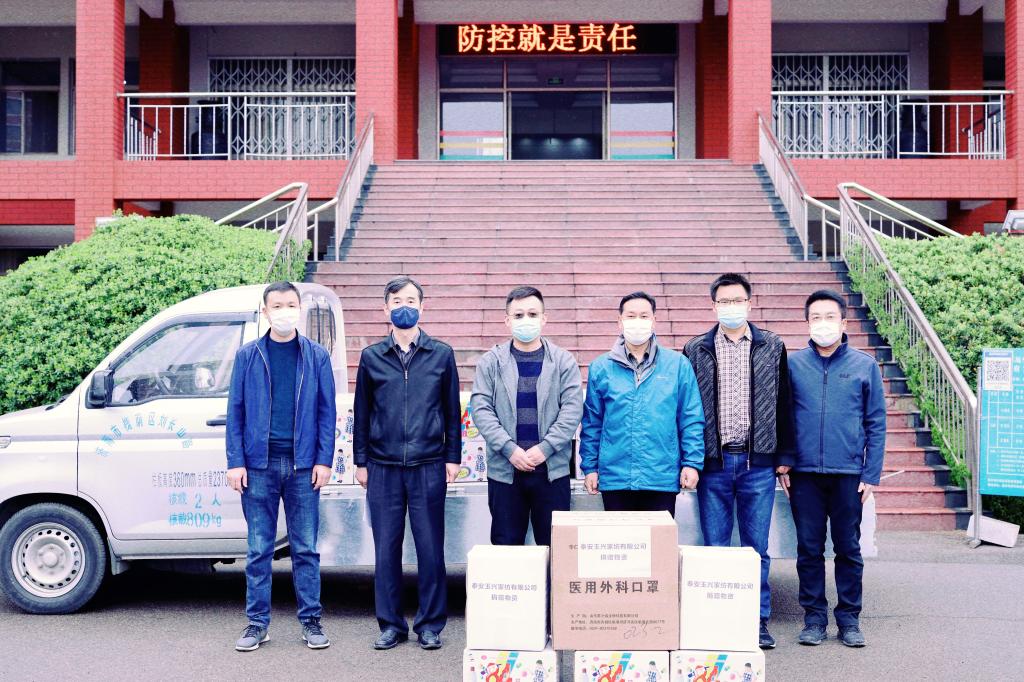 4月2日上午,泰安玉兴家纺有限公司负责人冒雨来到beat365官方网站泰安校区,向泰安校区捐赠了防护服30套、医用外科口罩2000个、84消毒液50箱等共计一万余元的疫情防控物资。校区管委副主任方亨福代表校区接受捐赠,对公司的爱心捐赠表示衷心感谢。