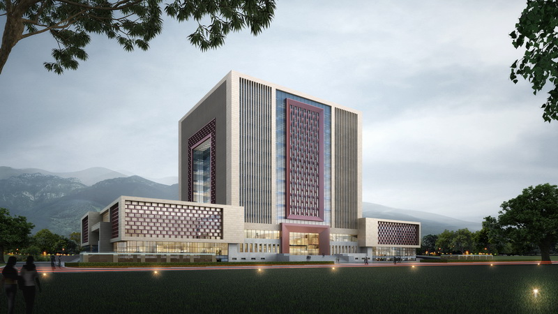 图书信息中心项目位于青岛校区校园中心,占地30000平方米,建筑面积69981.92平方米,地上57377.16平方米,地下12604.76平方米,规划设计高度70米,地上13层,地下1层,裙房3层。建设内容包括图书馆、会议报告中心、地下车库等,配套建设综合管网、绿地、道路、广场等设施。