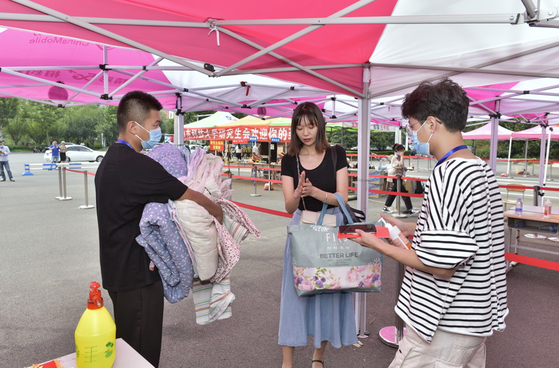 迎新现场,党委学校办公室、研究生院、学生工作处、团委、安全管理处、后勤管理处、网络安全与信息化办公室等部门的工作人员和来自各个学院的志愿者在各自的岗位上忙碌着,认真、耐心地引导帮助新生。体温检测、健康码查验、身份信息核对、物品消杀等环节井然有序,前来报到的研究生“刷脸”报到,所有手续“一站式”解决;工作人员和大学生志愿者认真热情地做好服务工作,为新生答疑解惑、搬运行李,解除新生入校困难……