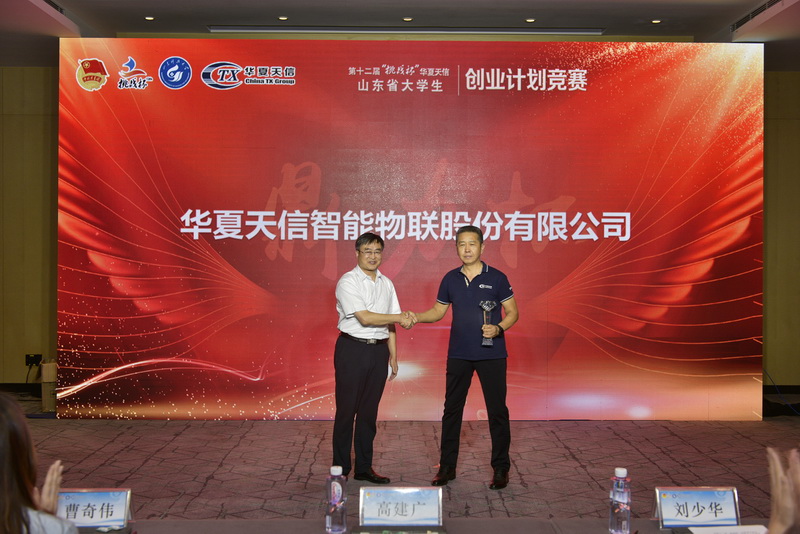 闭幕式上,揭晓了第十二届“挑战杯”华夏天信·山东省大学生创业计划竞赛决赛的获奖单位和作品,高建广向李汝剑颁发“鼎力”奖杯,刘少华、高建广与下一届“挑战杯”承办高校为山东大学进行赛旗交接。