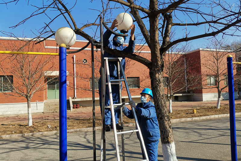工作人员更换校园内照明设备
