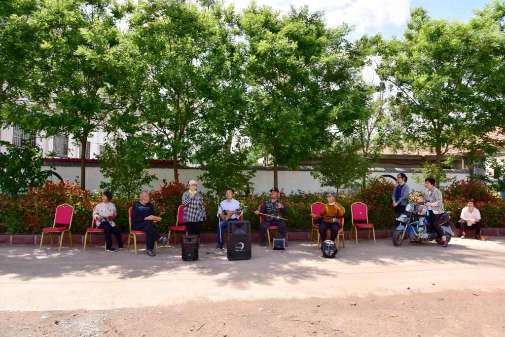 “东边升起了红太阳,祖国大地换新装……”午饭后,在纪庄村文化服务中心广场,由民间艺人组成的《姐儿妞》表演队正在开唱。