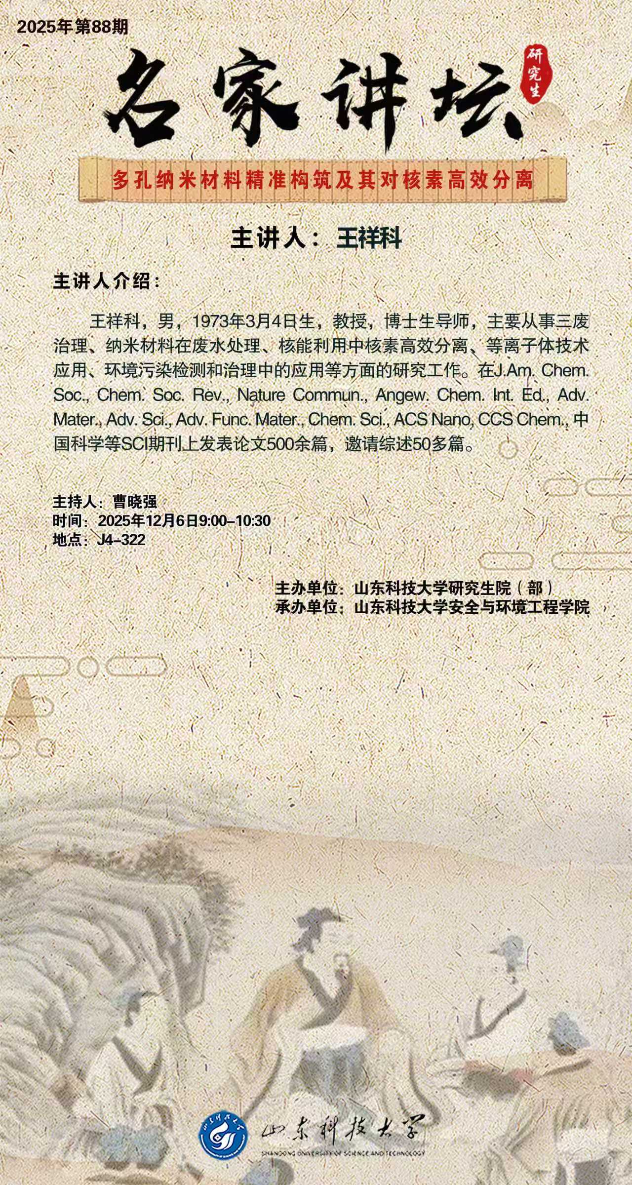 “名家讲坛”2025年第88期:多孔纳米材料精准构筑及其对核素高效分离(总1093期)
