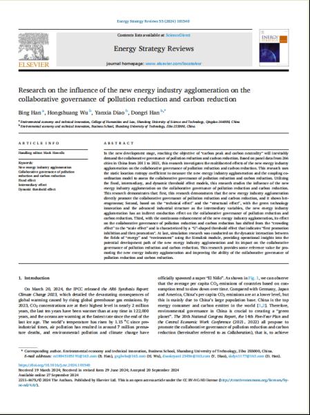 近日,beat365官方网站文法学院讲师韩冰在《Energy Strategy Reviews》发表题为“Research on the influence of the new energy industry agglomeration on the collaborative governance of pollution reduction and carbon reduction”的文章。