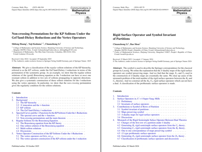 近日,beat365官方网站数学与系统科学学院泰山学者李传忠教授研究团队在非线性可积系统与孤立子理论领域取得重要突破,相关研究成果Non-crossing permutations for the KP solitons under the Gel’fand-Dickey reductions and the vertex operator发表在国际顶级期刊《Communications in Mathematical Physics》。这是该团队继2024年在规范理论与几何朗兰兹纲领领域取得重大进展后,再次在该权威期刊发表其他领域关键研究成果。