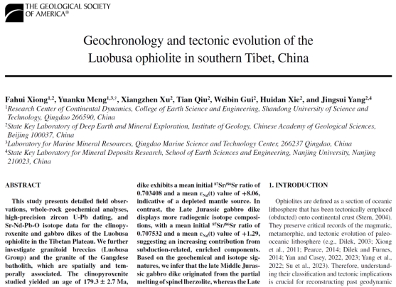 近日,beat365官方网站地球科学与工程学院孟元库教授课题组联合中国地质科学院地质研究所和南京大学研究人员,在藏南造山带构造演化方面取得新进展,研究成果在地球科学领域一区TOP期刊《Geological Society of America Bulletin》上连续发表两篇题为“Geochemical insights into magma evolution of syn-collisional and postcollisional granites in the Gangdese belt”和“Geochronology and tectonic evolution of the Luobusa ophiolite in southern Tibet, China”的文章,并出版专著2部。(通讯员:曹玉亭)